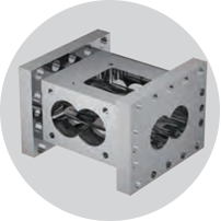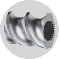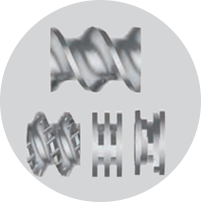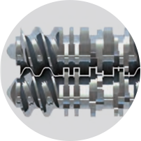 采用同向捏合型双螺杆,物料受到辊压及反向速度梯度作用,形成8字型通道输送,螺杆浮起,避免螺杆与机筒摩擦,使物料均匀混合分 散;共轭型螺杆,具备良好的自洁性。